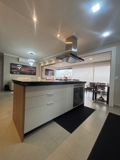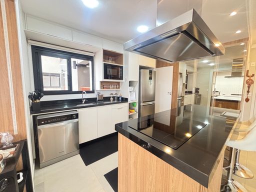Cozinha equipada com fogão de indução, coifa, forno a gás e micro-ondas embutido